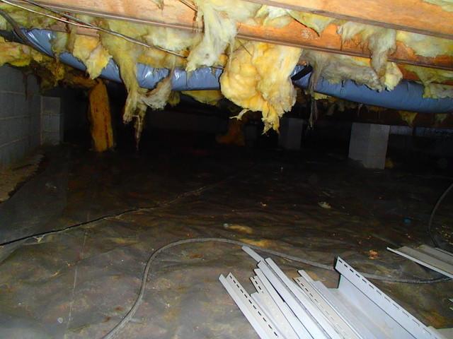 Although this homeowner does have a protective covering on the floor of his/her crawl space, the crawl space is still not properly sealed from air and moisture. As we can see, the falling insulation is damaging this space. When we allow air and moisture into our crawl space, we are compromising the integrity or any insulation we may have, the wooden structures of our homes, and ultimately our home's comfort level. Call Dr. Energy Saver today to fix any issues you may be having with your crawl space.